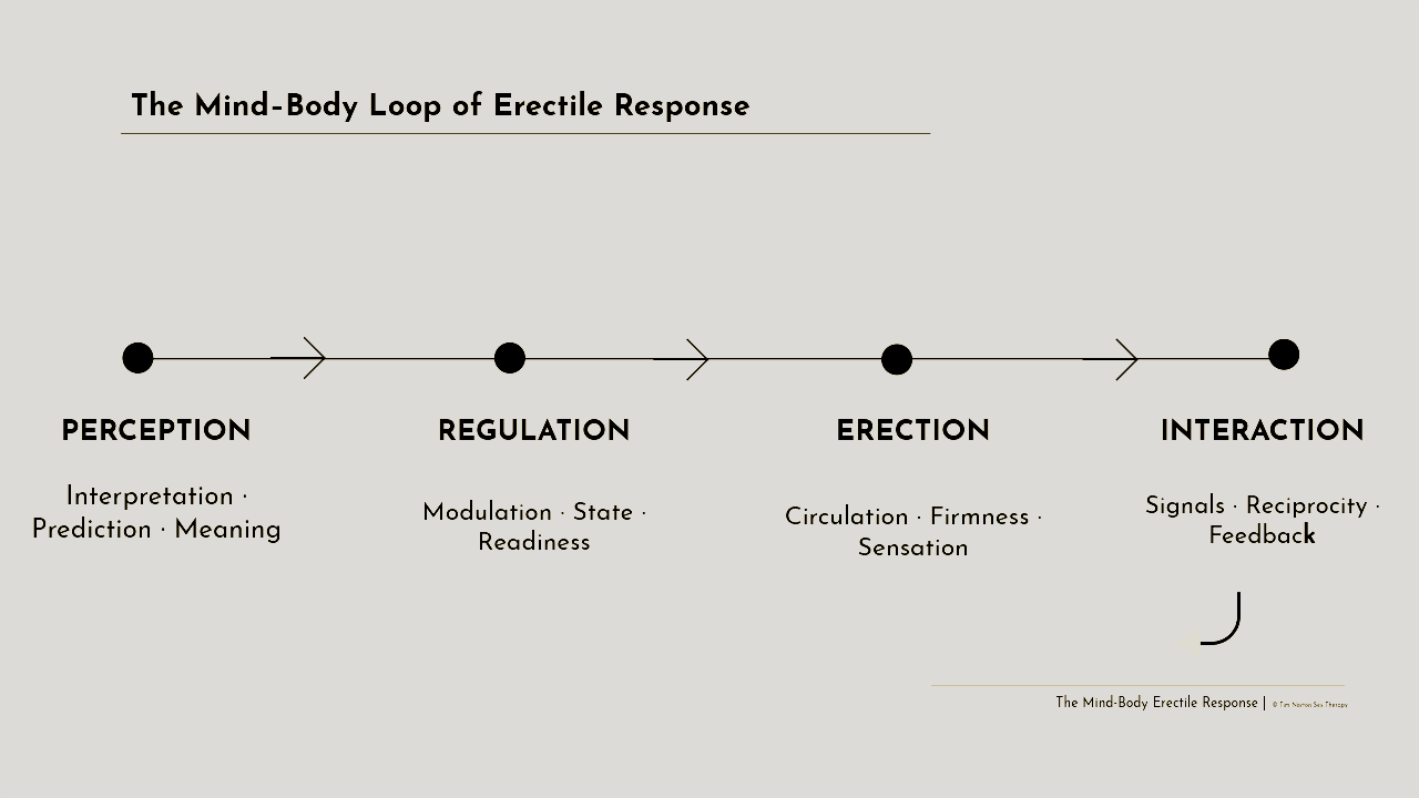 Modern neuroscience has radically expanded our understanding of erections. We now know that erections are not governed solely by hormones or blood flow, but by a finely tuned network that integrates threat detection, autonomic regulation, sensory processing, emotional context, and learned neural patterns. The nervous system continuously evaluates safety, connection, and internal state; even subtle shifts in stress, relational dynamics, past experiences or cognitive load can alter the erectile response long before any physical pathology is present. Research in neuromodulation, predictive processing, and sexual psychophysiology all point to the same conclusion: many erectile difficulties arise not from a failing body, but from a nervous system working exactly as it was trained to work under pressure. This modern perspective allows us to see the erectile cycle with clarity so we can work directly with it.