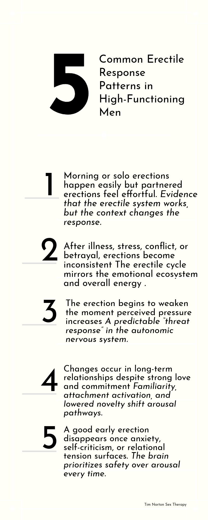 Understanding this intricate bio-behavioral process is only the beginning. Each man’s erectile pattern is shaped by dozens of interacting variables, psychological, relational, sensory, contextual, and neurophysiological creating hundreds of inflection points where the erectile cycle can be interrupted.